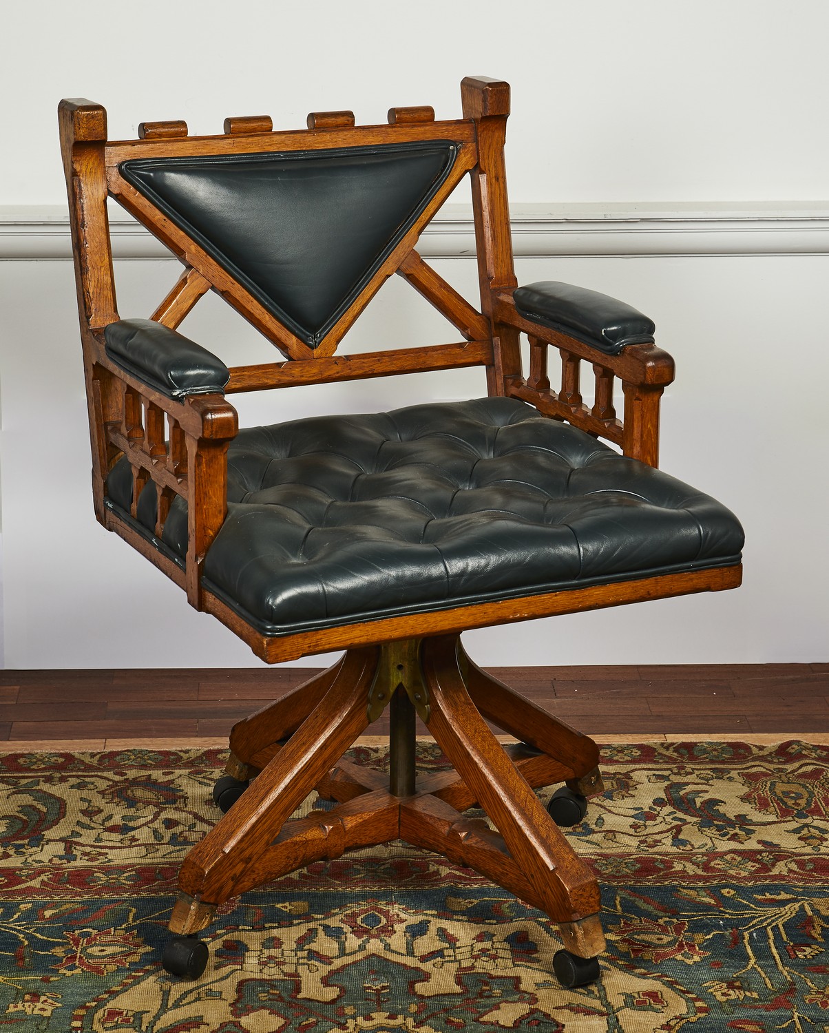 With a crenellated top rail and triangular leather padded backrest in chamfered strut supports, the padded arms with square chamfered supports flanking the buttoned leather seat, on four triangular strut legs with later castors.