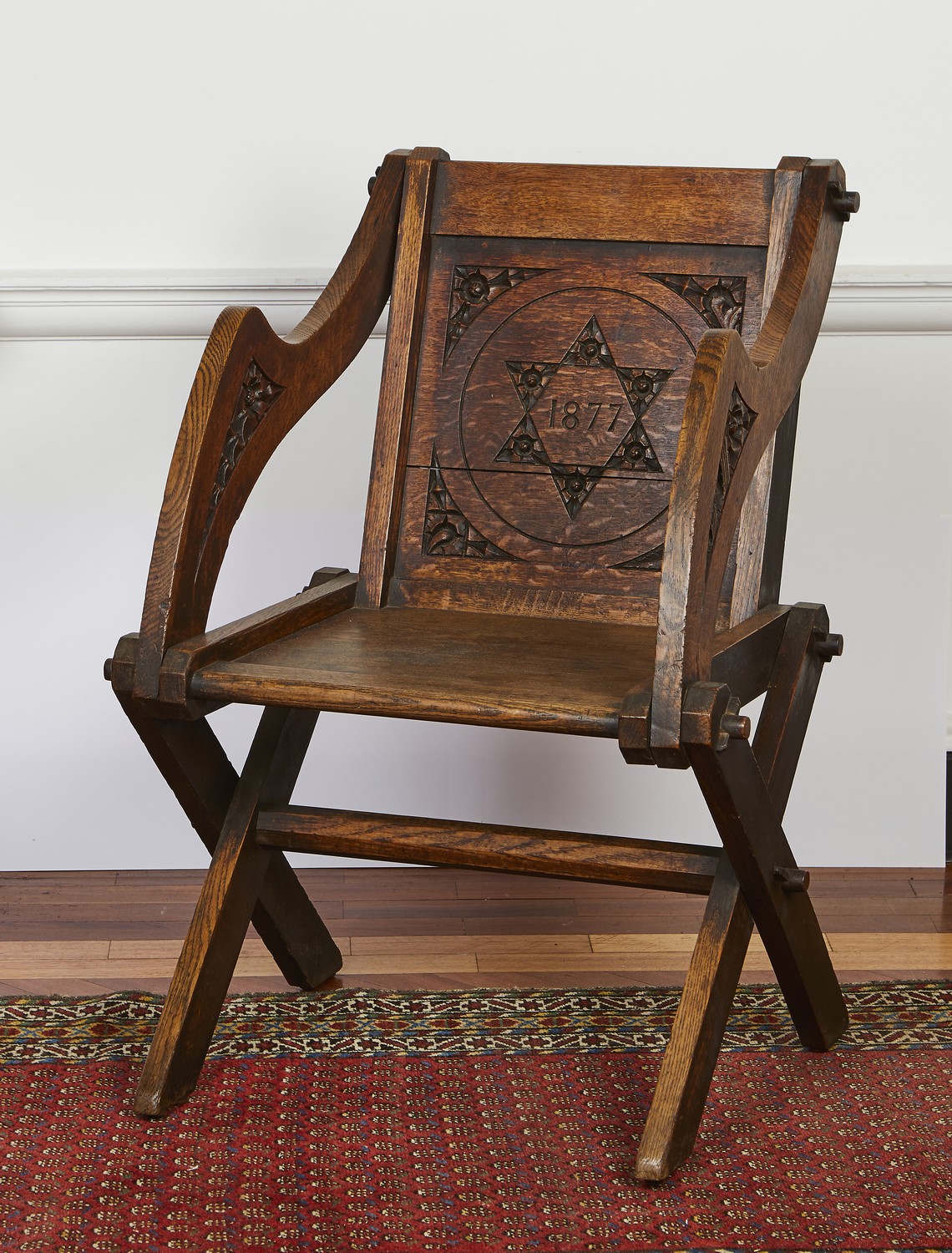 Of typical pegged construction, the panel back incised with the date 1877 within a star, flanked by relief carved shaped arms, above the panel seat, on X-frame side supports.