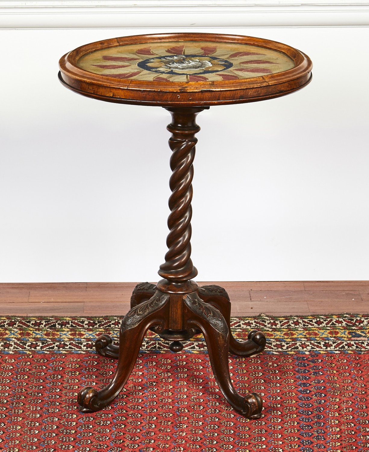 The oval glazed top enclosing a panel of Berlin woolwork of roses and foliage, on a spirally carved tapering pedestal and three leaf carved swept feet.