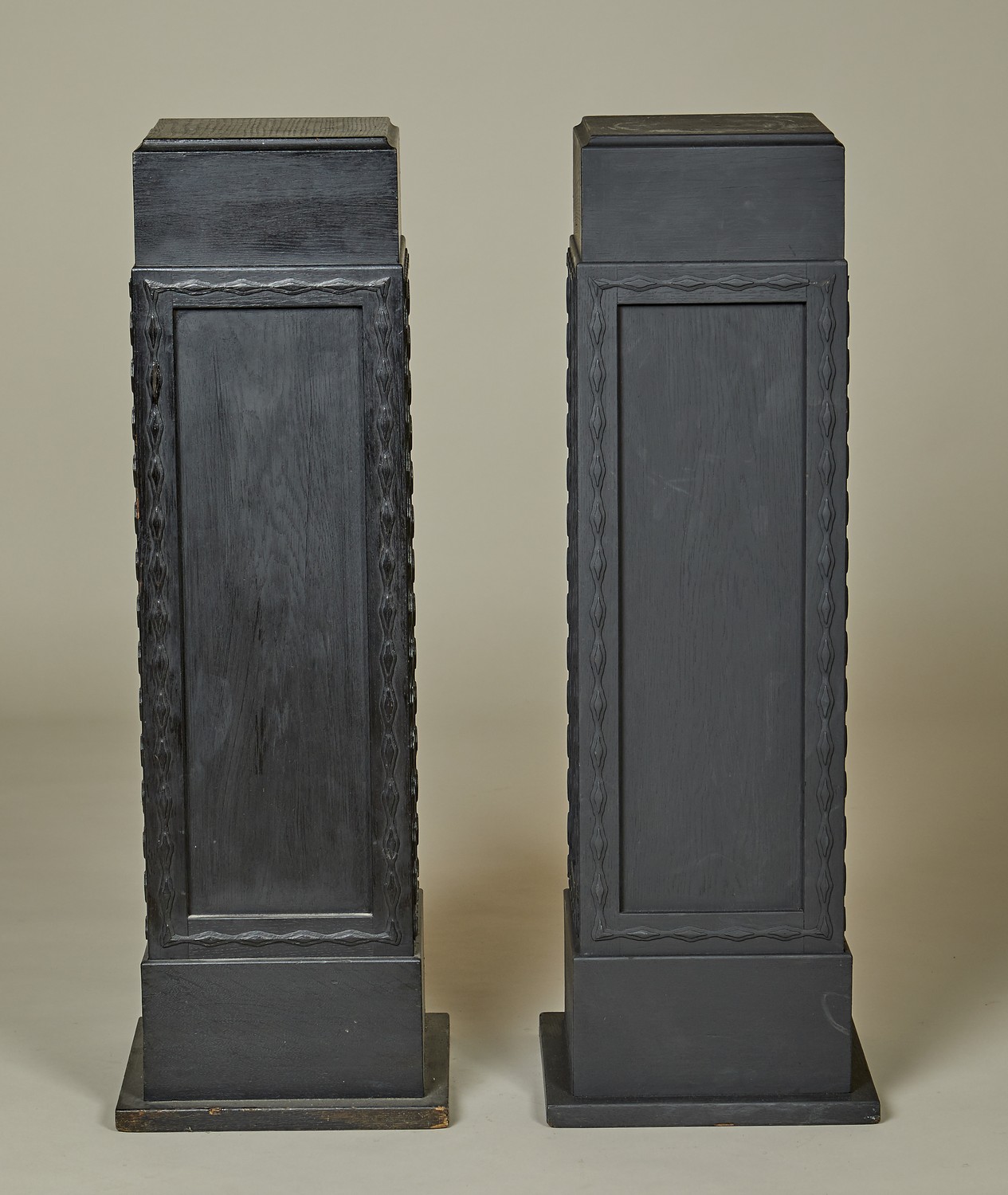 Each painted black with lozenge mouldings to the panelled sides.