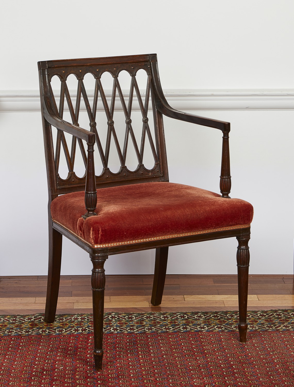 The back with a panel of lattice, the padded seat flanked by turned and partially reeded arms, on turned and partially reeded front legs.
