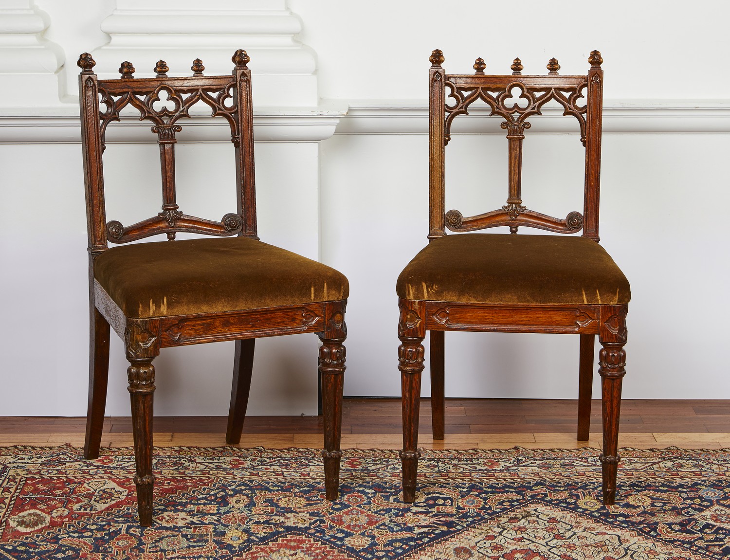 In the manner of George Smith, each with crocketted finials to the top rail above trefoil and ogee arch caved splat, the stuff over upholstered seat, on leaf carved cluster column front legs.