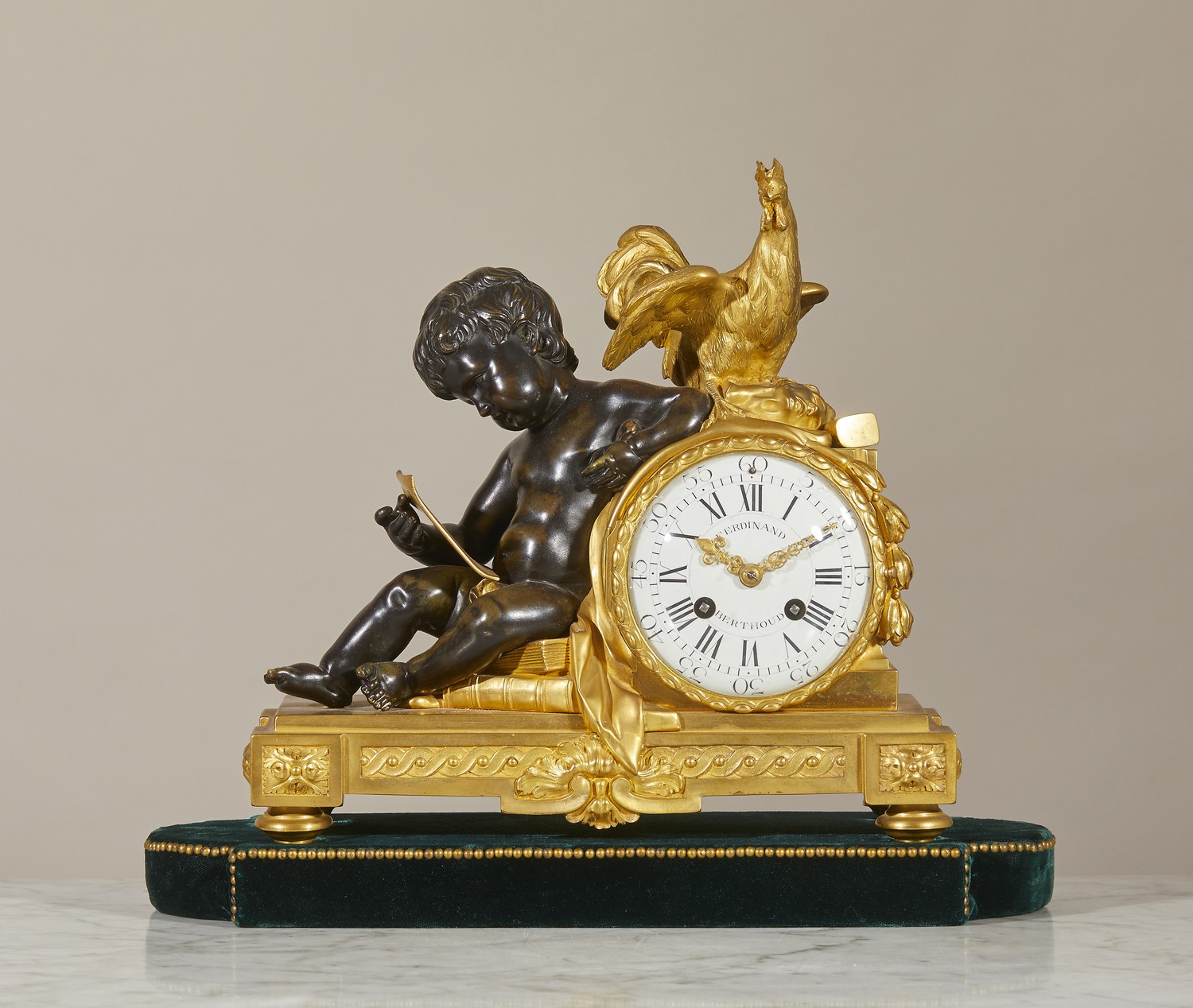 The silk suspension movement chiming on a bell, the enamel dial with Roman hours and Arabic minutes, pierced gilt hands, the case surmounted by a cock, standing on a sculpted head with a chisel and mallet, symbolic of sculpture, with a bronze putto seated on books regarding a sheet of paper, the base with foliate bosses and panels of entrelac centred with acanthus, on toupie feet, and velvet covered plinth.