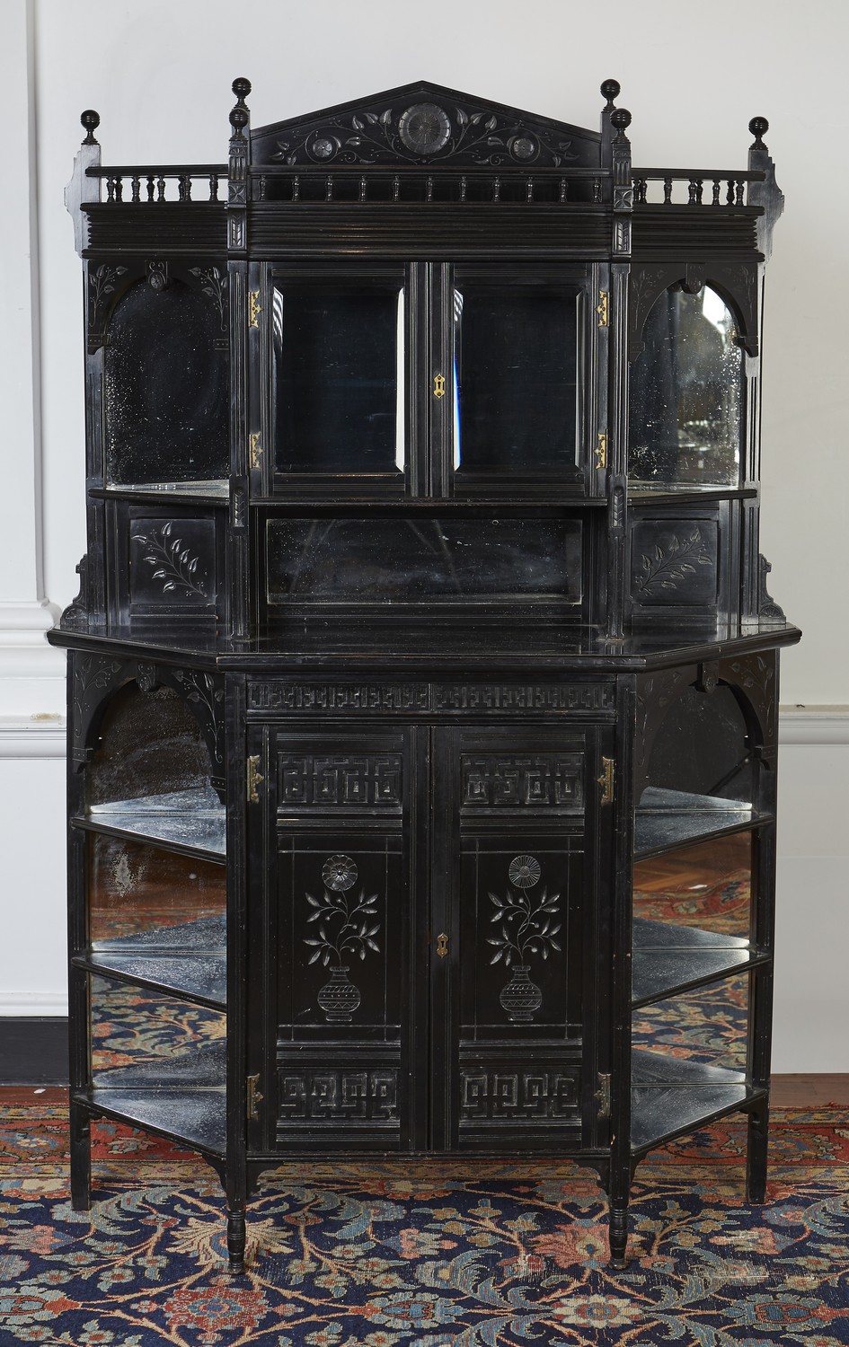 In the manner of Charles Eastlake, the pedimented top with ball finials, above a spindle gallery and a pair of glazed doors flanked by open mirrored shelves, the base with a pair of doors having blind fretwork and incised with sunflowers in pots, flanked by angled shelves.