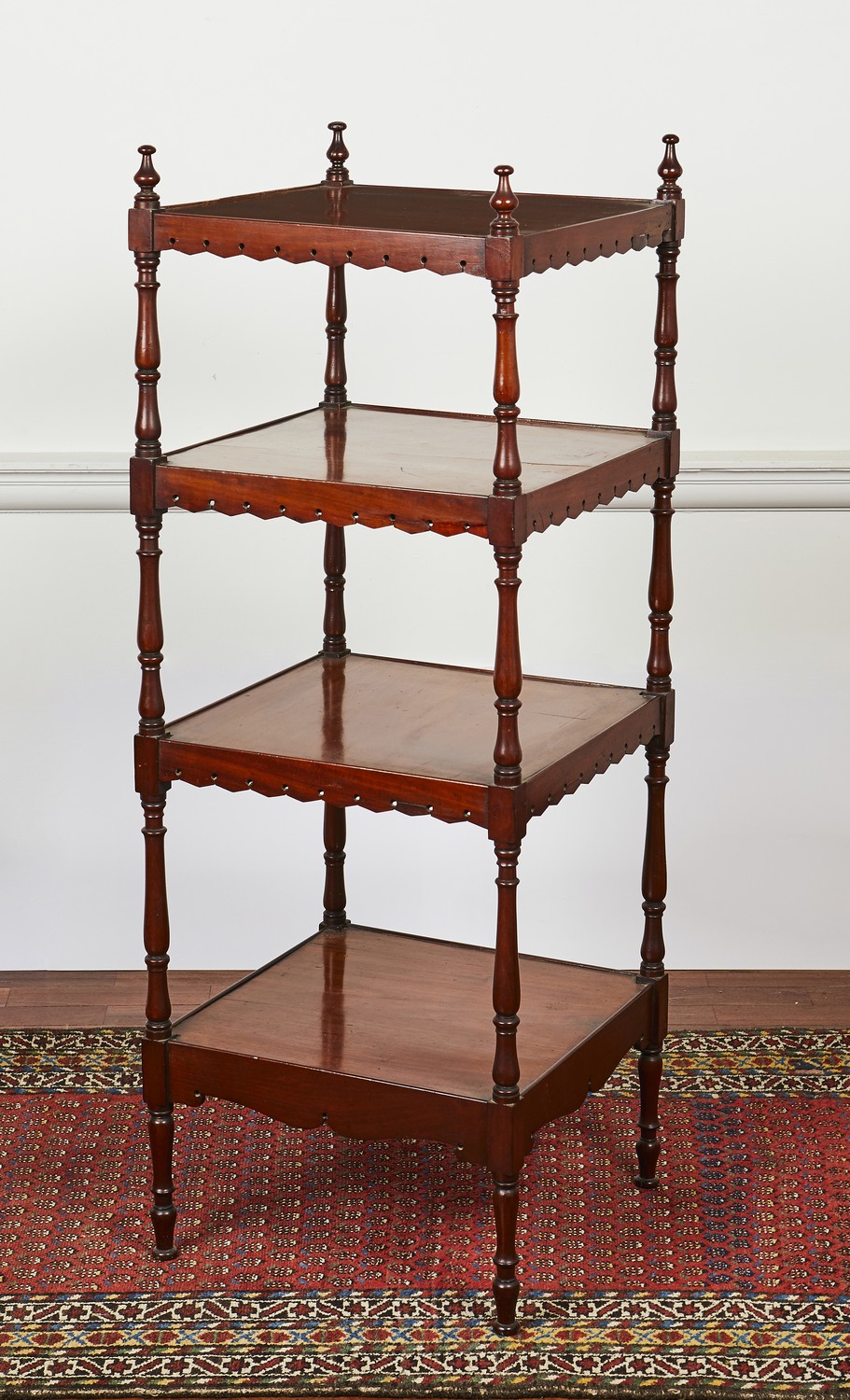Each square tier with lappeted edges and baluster turned uprights on turned legs with castors.