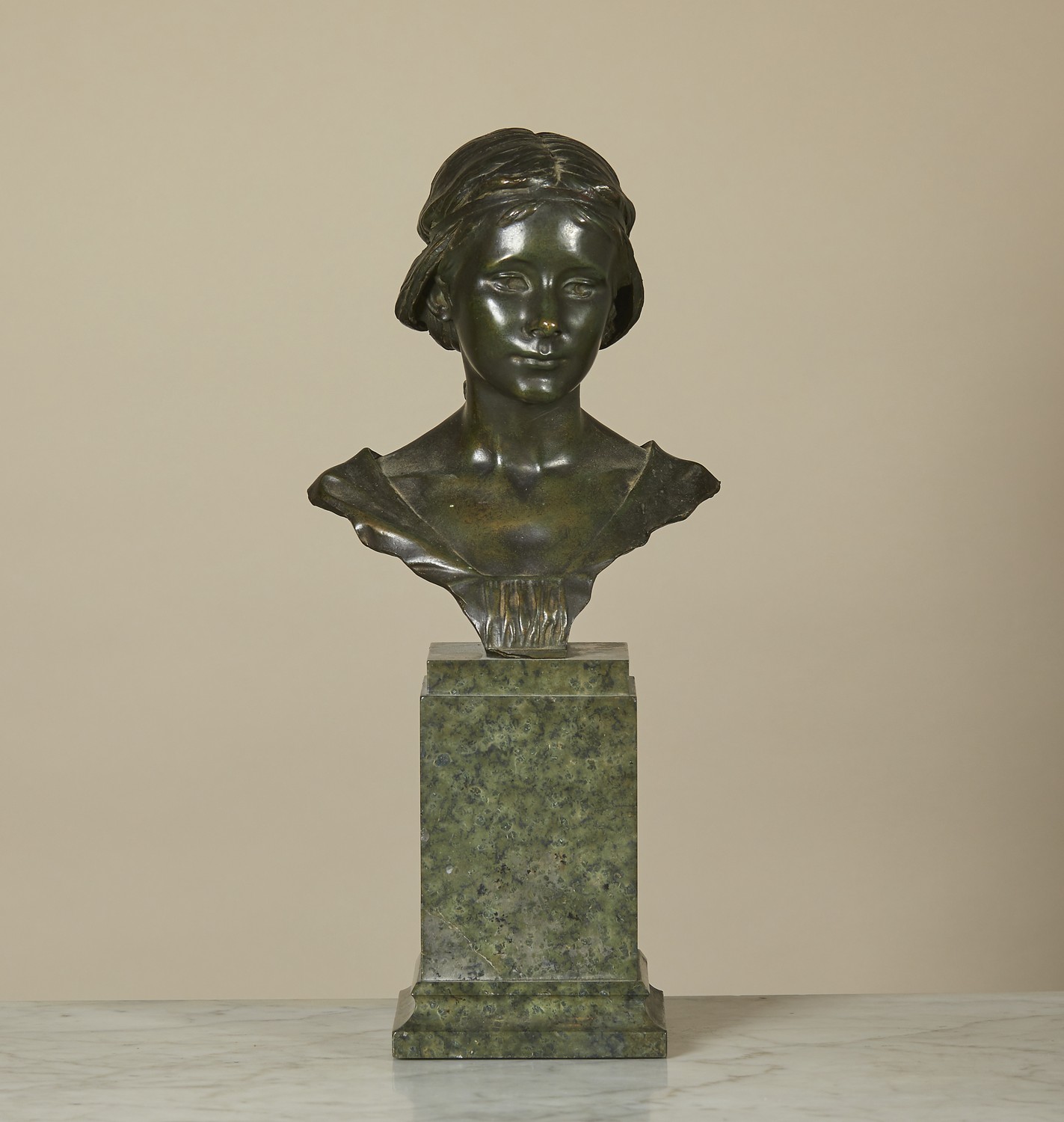 Overall in Very Good Condition. Original green-black patina, with wear to nose (consistent with age and handling). Visible cracks through the marble base, though repaired.