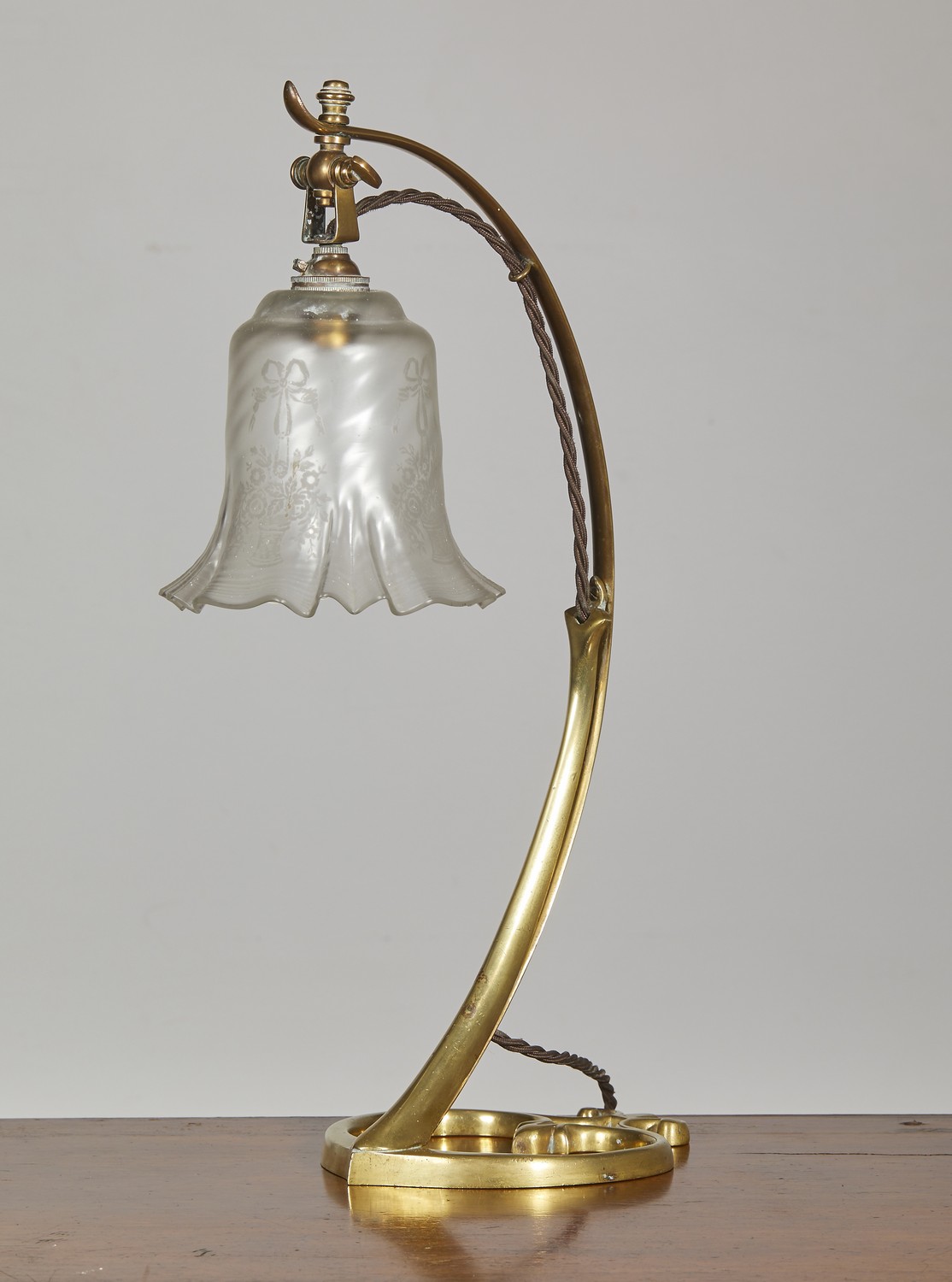 The heart shaped base with scroll terminal, the long arched arm terminating in a frosted glass shade.
