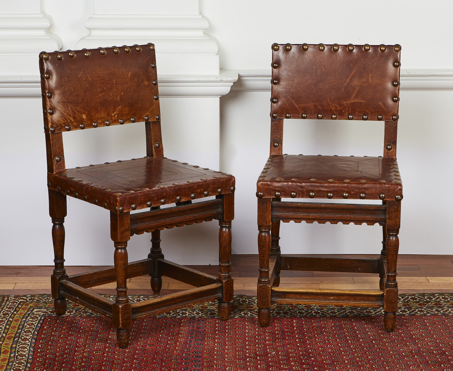 In the Henri II style, each with leather back and seat with moulded seat rails and stretchers, inverted baluster supports and turned feet.