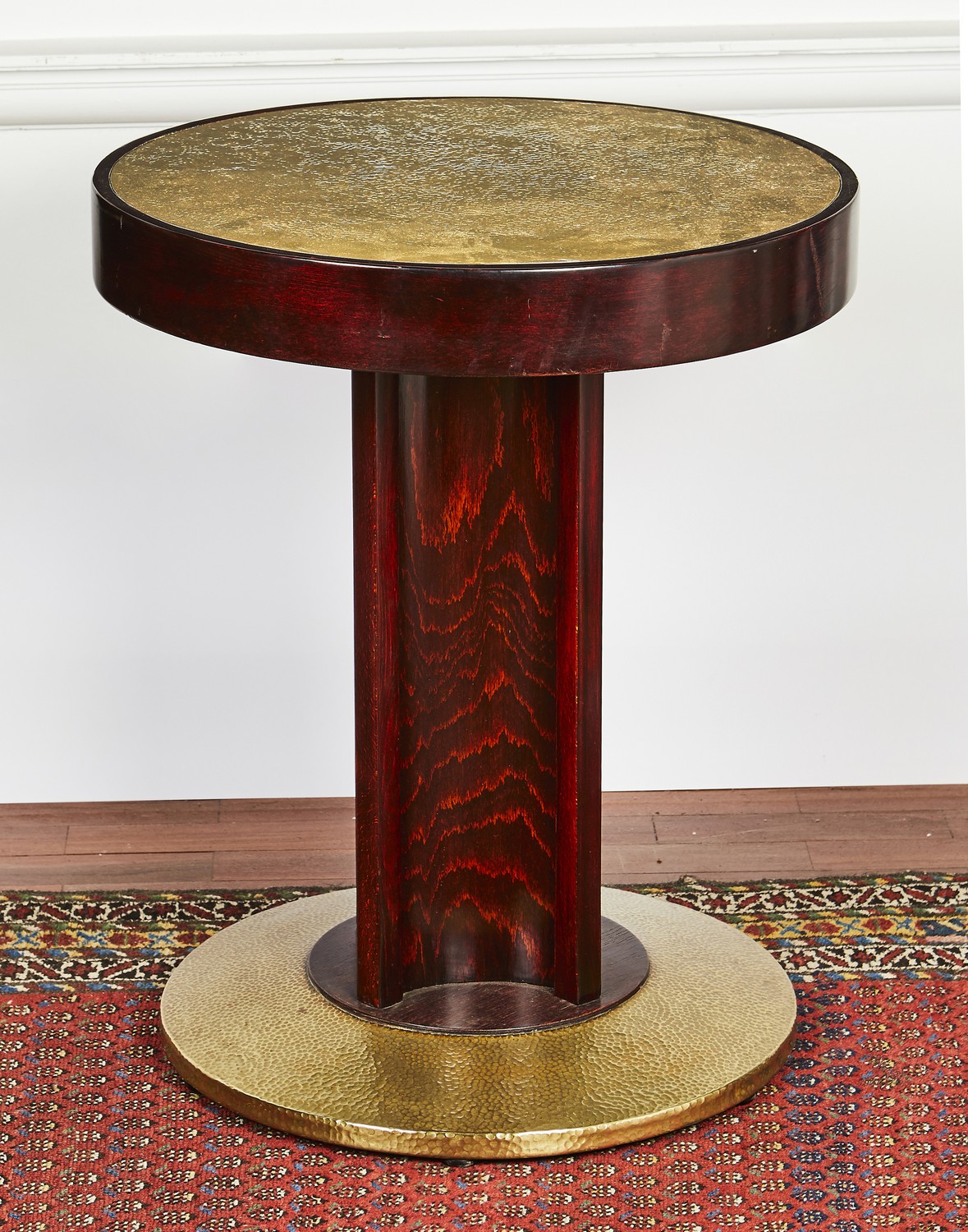 The hammered brass inset top on a stained beech pedestal with concave sides, on a circular hammered brass base.