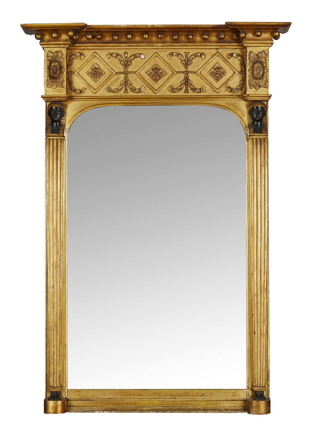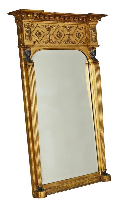 The ball decorated cornice above a broad frieze ornamented with acanthus motifs and rosettes, the arched bevelled plate flanked by fluted Egyptian herms with ebonised faces and feet.