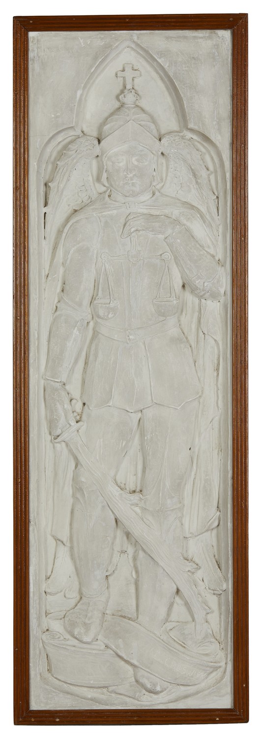 Depicted standing in a gothic niche, in armour holding a flaming sword and scales for weighing souls, standing on a scroll inscribed B. CRESWICK.