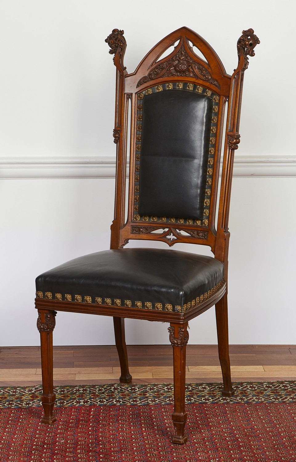 Stamped to the seat rail "ENTWORFEN VON L LOEFFLER IN LONDON ANGEFERTIGT IN KARLSRUHE BADEN 1896" The gothic arched cresting centrex with a carved stylised pineapple amidst scrolling tendrils, flanked by similar scrolled finials, the padded back and seat with original gilt foliate studs, the square tapering legs with scrolled tendril headers.