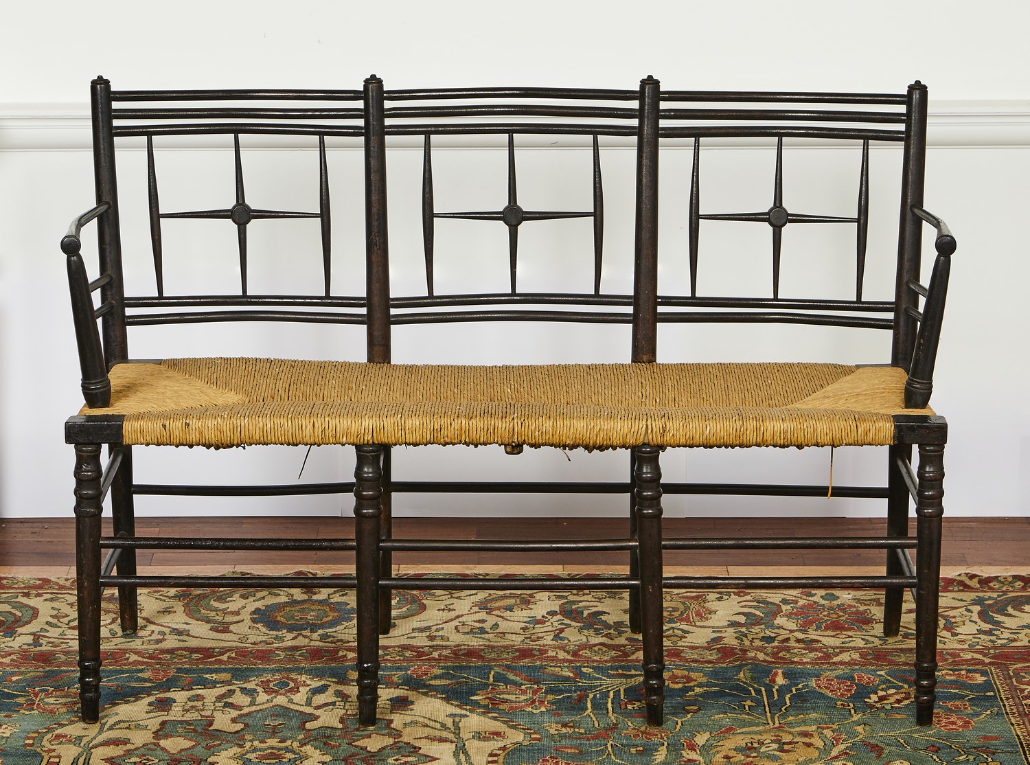 With turned uprights, triple top rail and spindle detail with central cross, rush seat, double front stretchers.