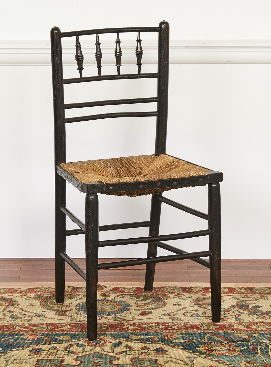With turned uprights, spindle back and rush seat, double front stretcher.