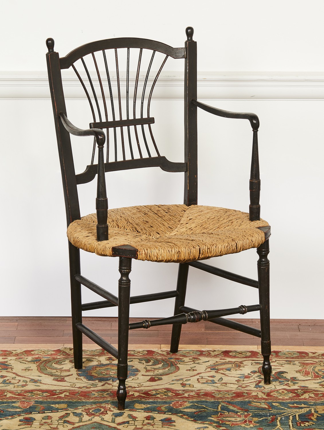 With arched top rail above a wheat sheaf spindle, the oval rush seat on turned legs with spindle turned front stretcher.