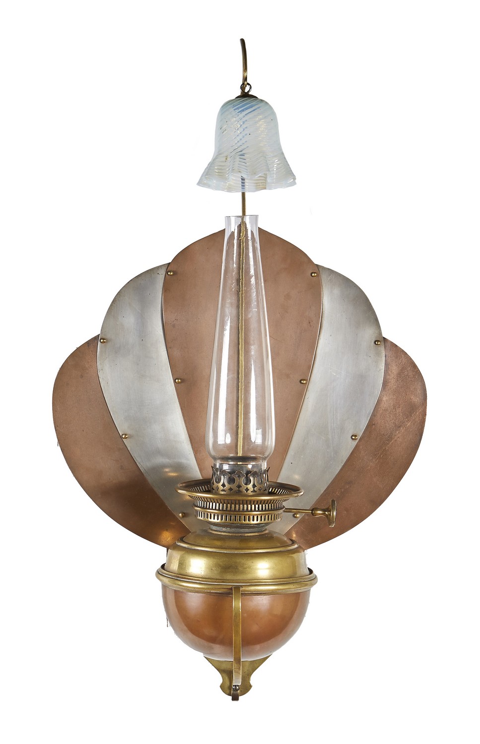 The petalled backplate of silverplate and copper panels, with a tendril supporting a Powell opalescent glass soot shade, above the flue and hemispherical reservoir, electrified.
