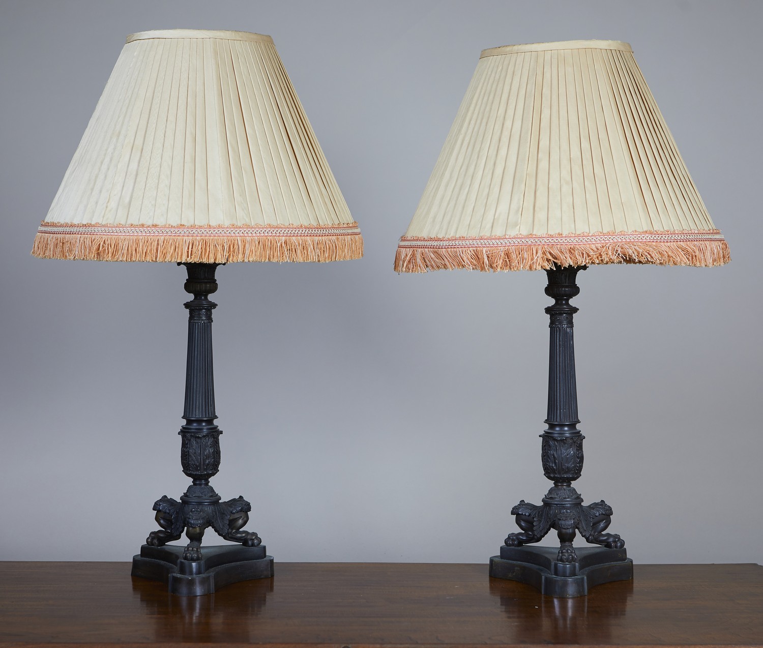 Each with urn shaped nozzle on fluted shaft supported by three lion paw feet on a plinth base.