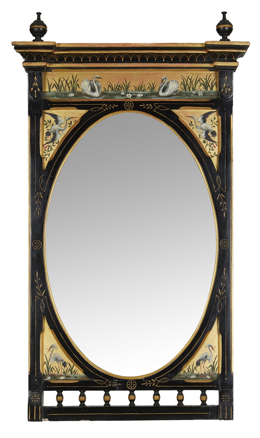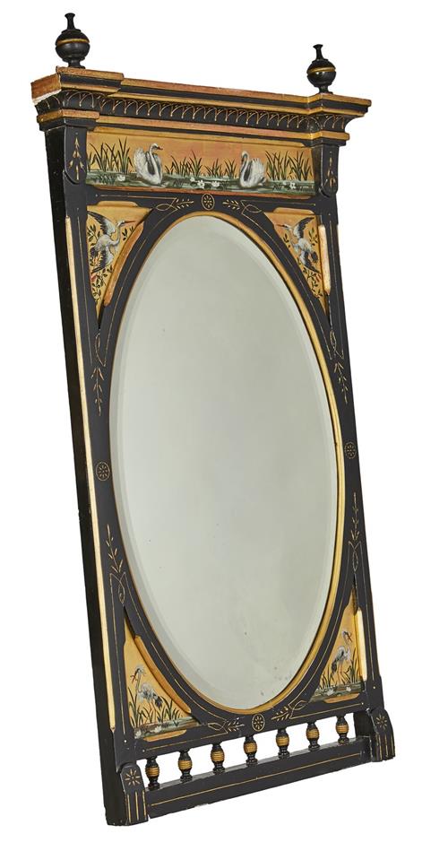 The oval bevelled plate in an ebonised panelled frame with turned finials, painted in colours on a gold ground to the frieze and spandrels with swans and cranes, having incised and spindle turned detail.