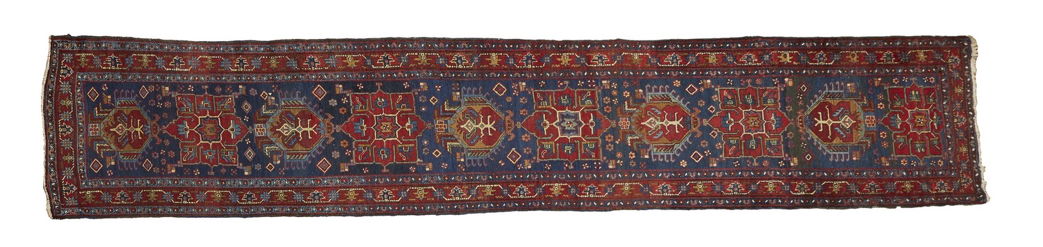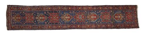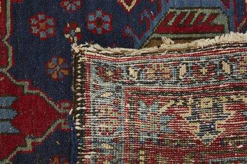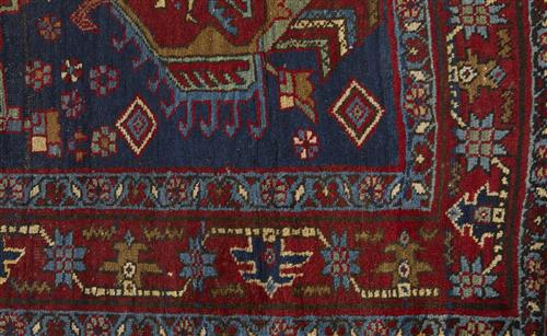 With all over repeated boteh on a red field, within multiple geometric borders.