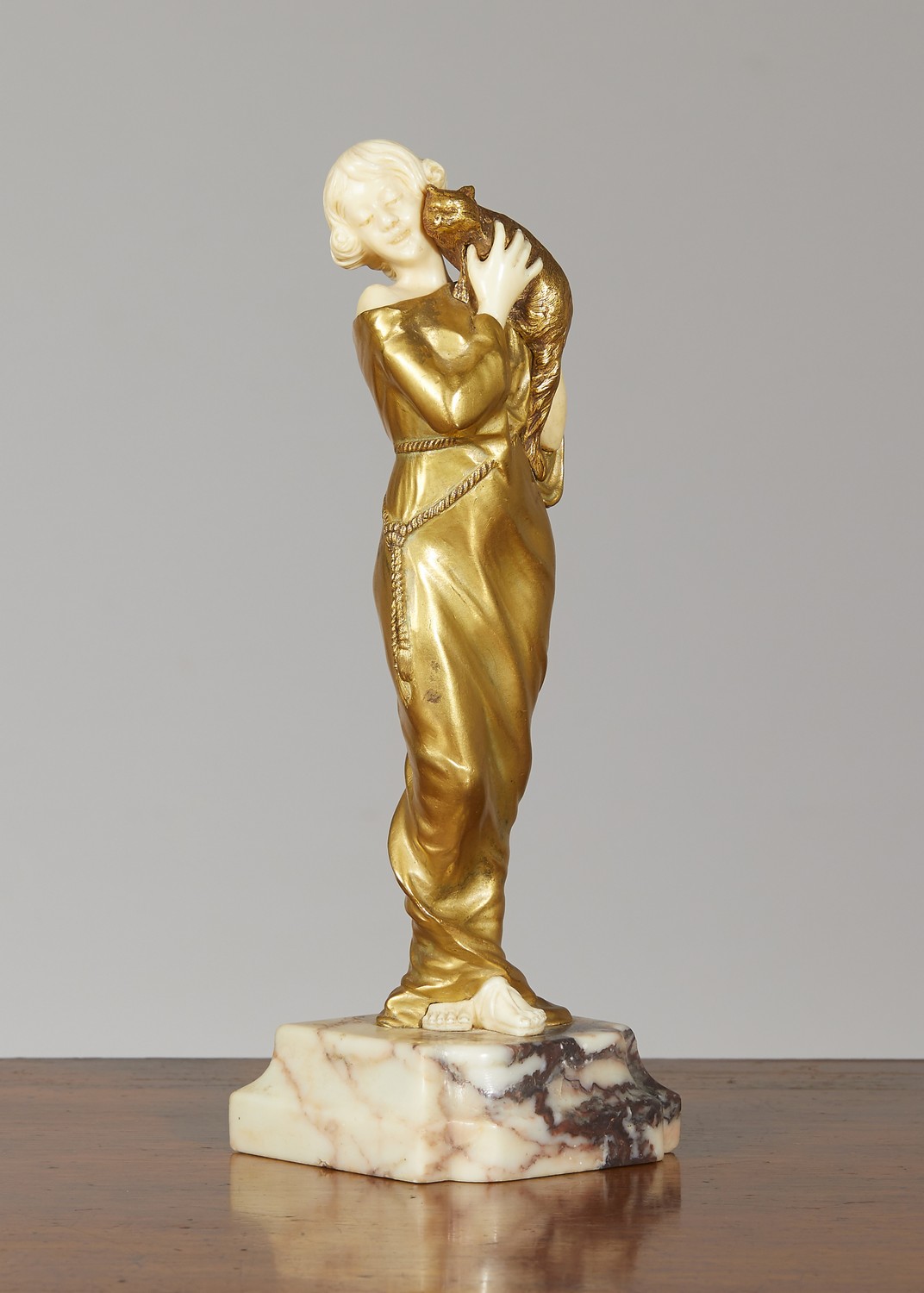 Of a young woman in a loose robe holding her pussy, on shaped marble plinth signed A Gory in the marble, the bronze stamped 829.