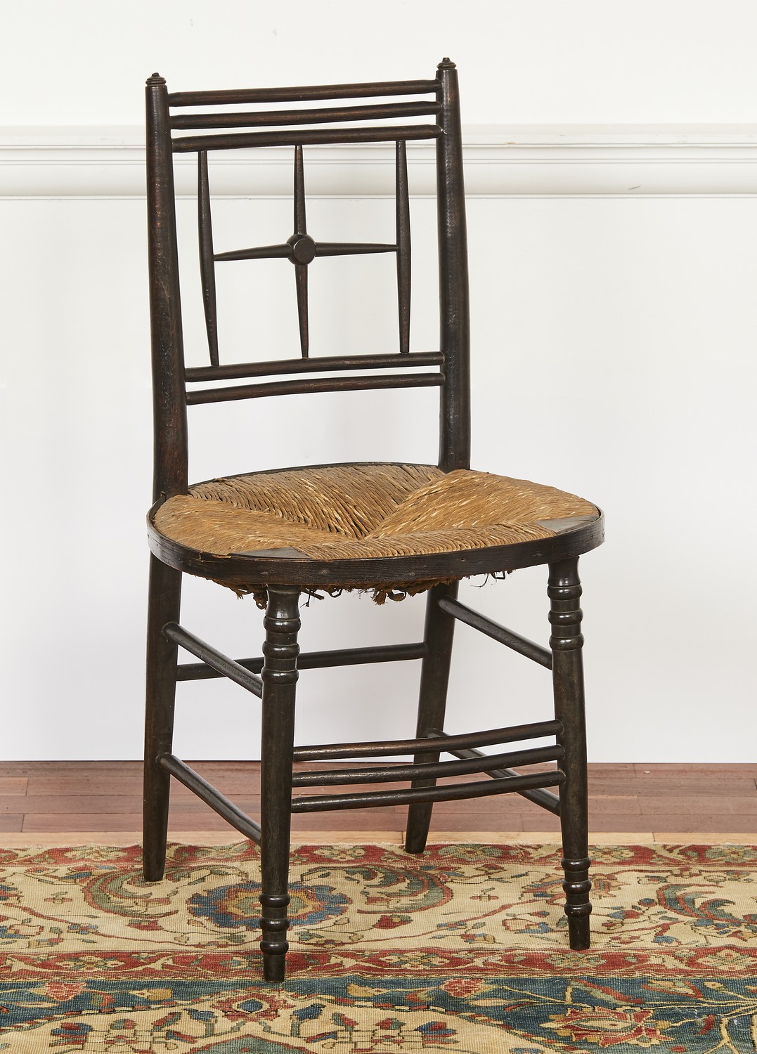 With turned uprights triple top rail and spindle detail with central cross, oval rush seat, triple front stretcher.