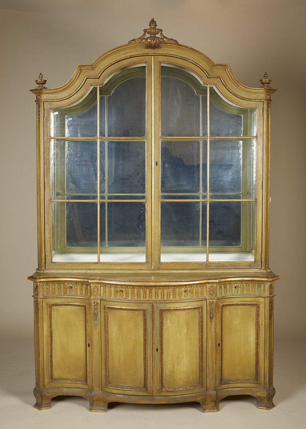 In the 18th century style, the shaped top above a pair of astragal glazed doors, the serpentine base with a fluted frieze above four cupboards on shaped bracket feet.