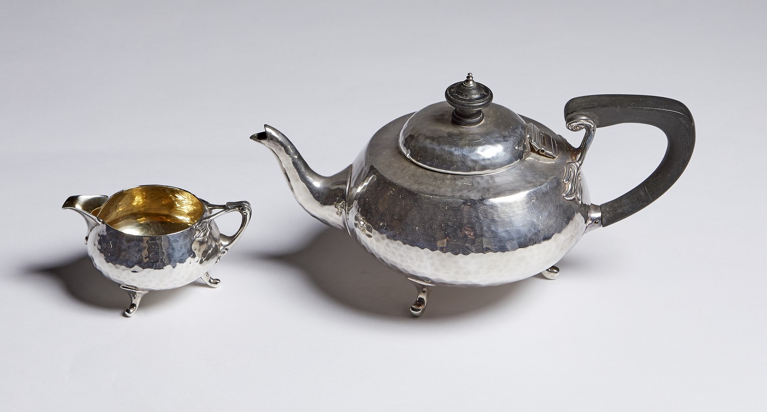 Of squat cauldron form with hammered finish, the ebony handle with leaf cast scrolls, and raised on short scroll legs, hinged cover with ebony knob, the matching creamer with gilt interior.