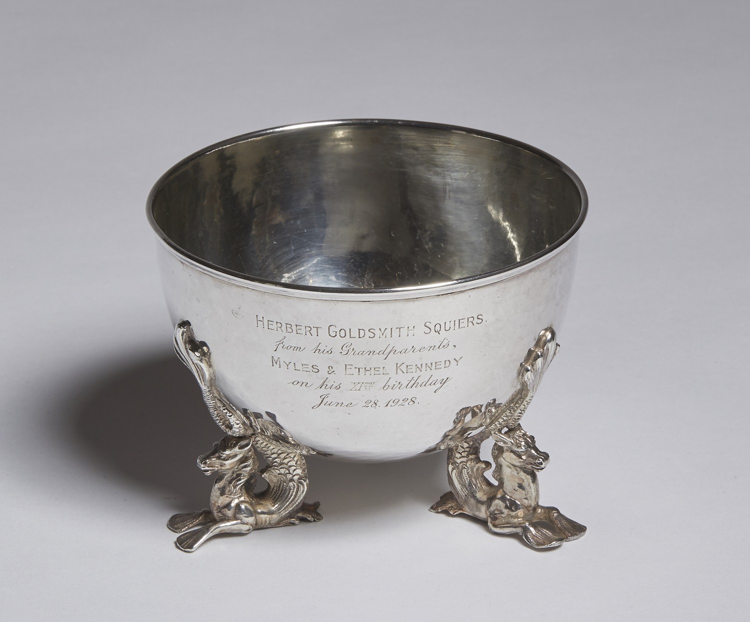 London import mark for 1925, hemispherical with moulded rim, on three hippocamp feet, inscribed HERBERT GOLDSMITH SQUIERS from his Grandparents MYLES & ETHEL KENNEDY, on his XIth birthday, June 28,1928.