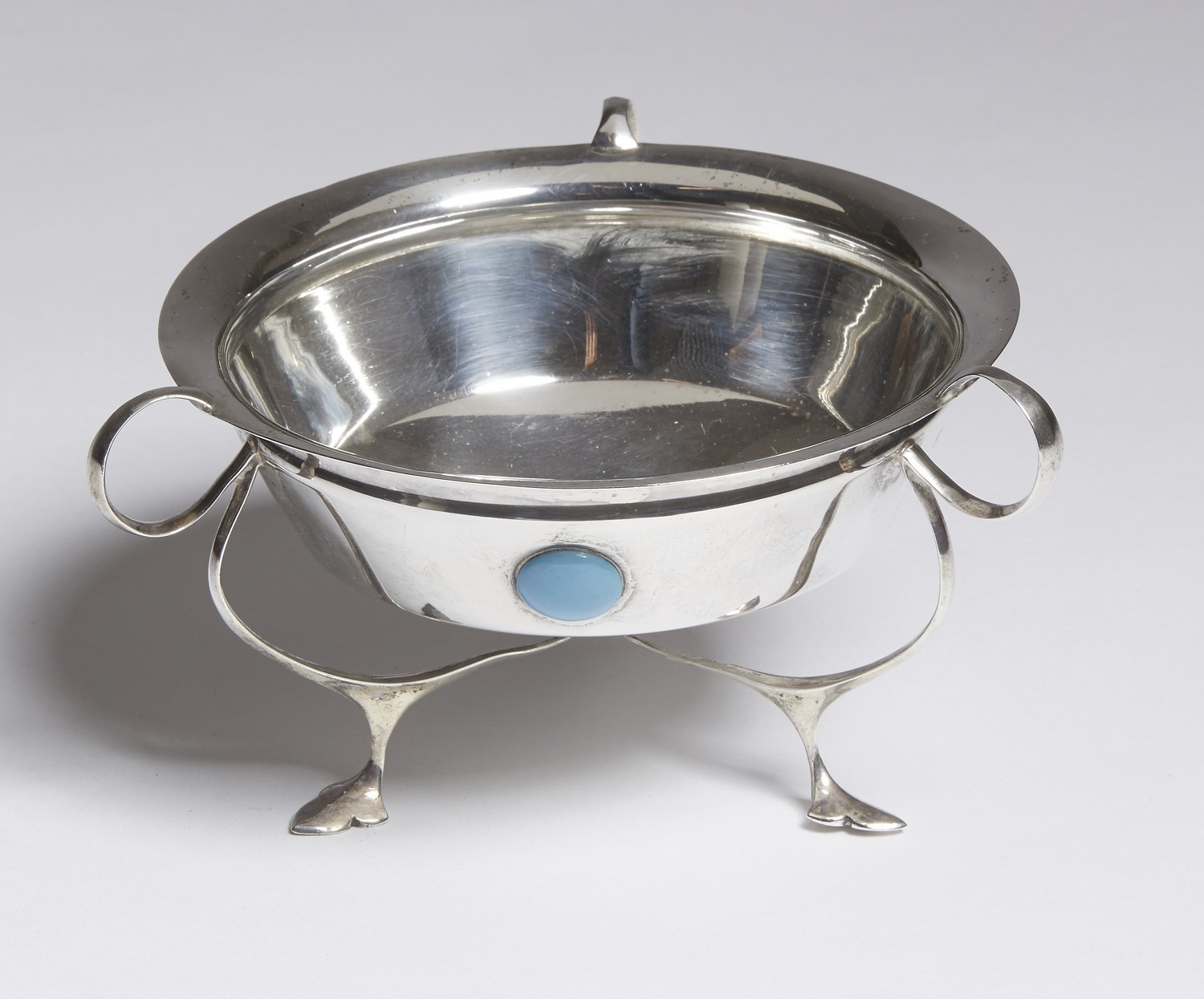 Maker's mark of John Round & Son, Sheffield 1905, with three loop handles and feet, the flared bowl set with blue glass cabochons.