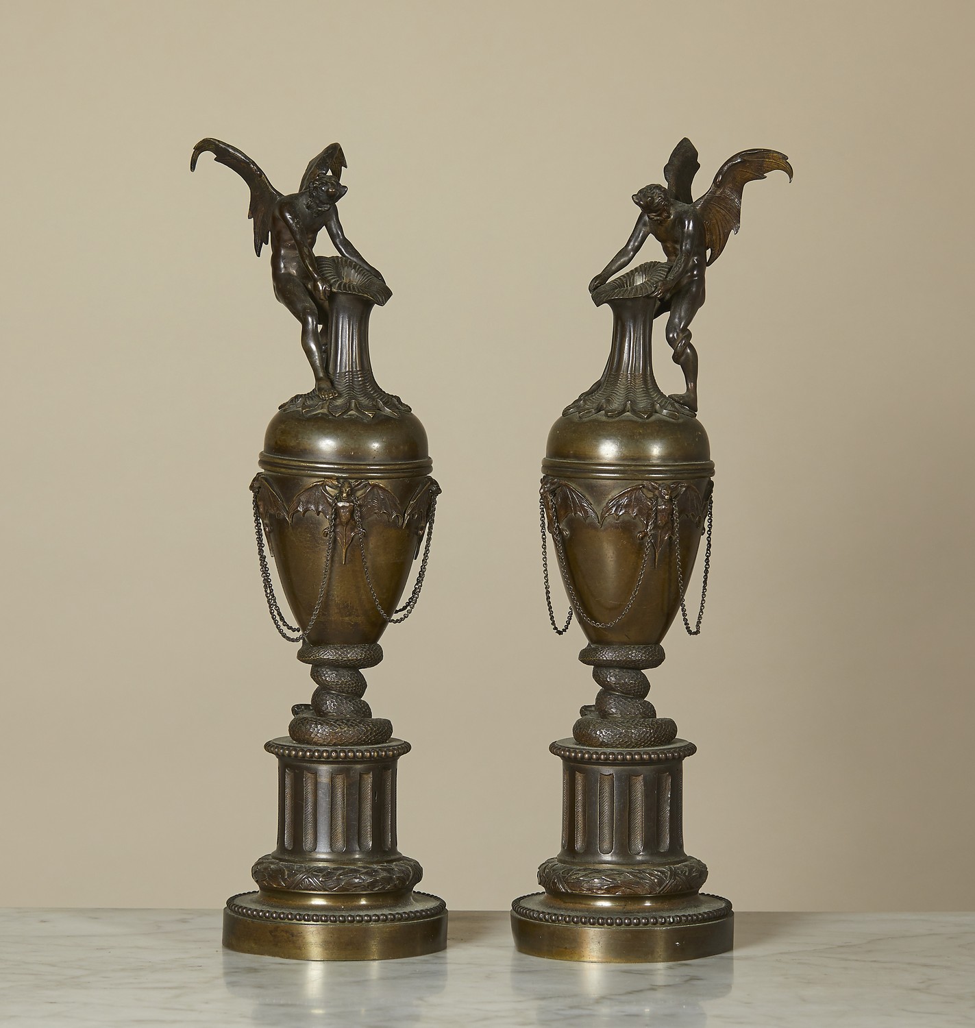 Each with an ovoid body cast with bats surmounted by a winged demon grasping a tropical flower, on a snake entwined socle, the integral fluted plinth cast with beads and bands of laurel (2).