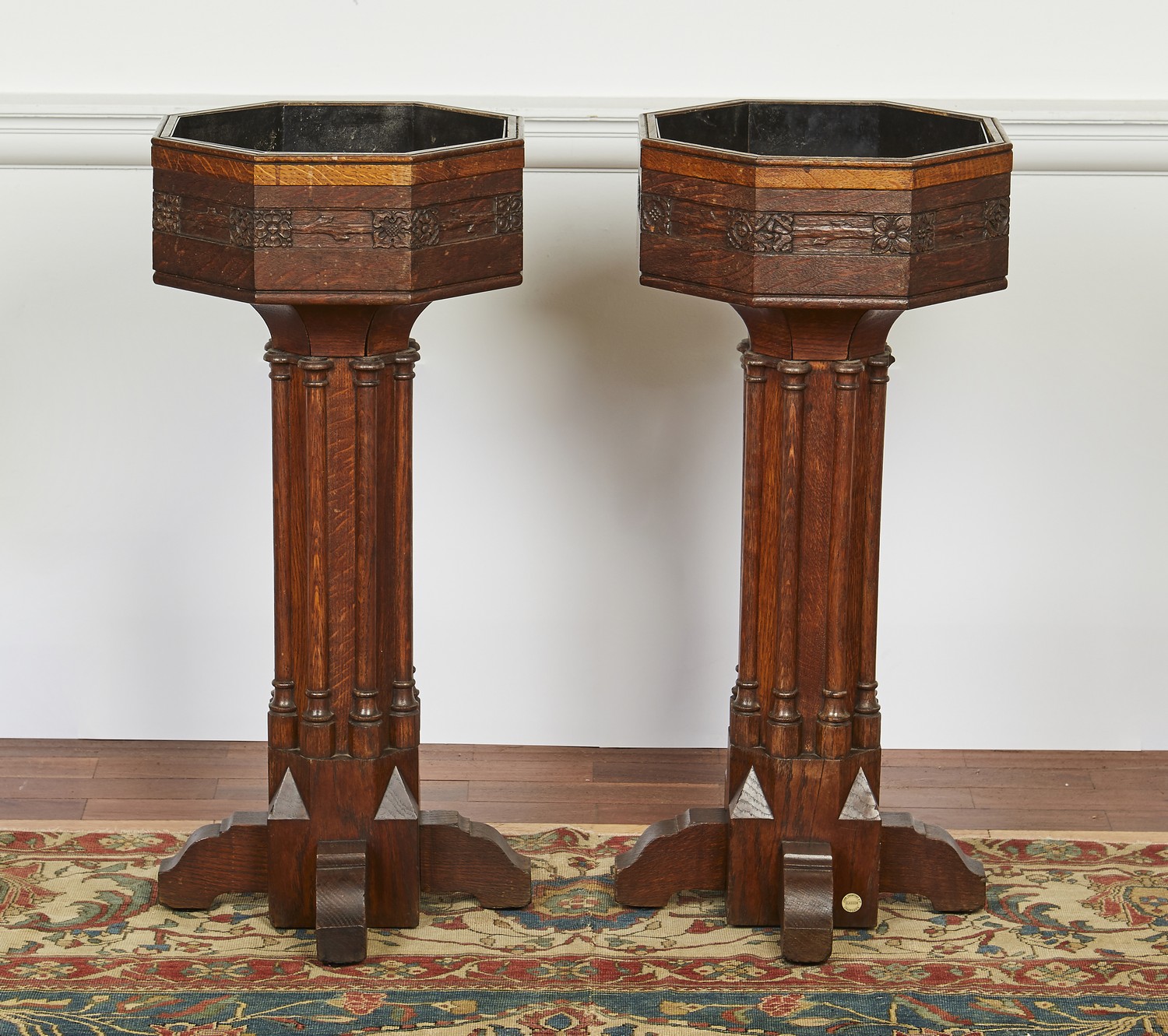 Each octagonal planter with later liner, carved with a frieze of stylised flowerheads, on a cluster column pedestal and four shaped feet, maker's label.
