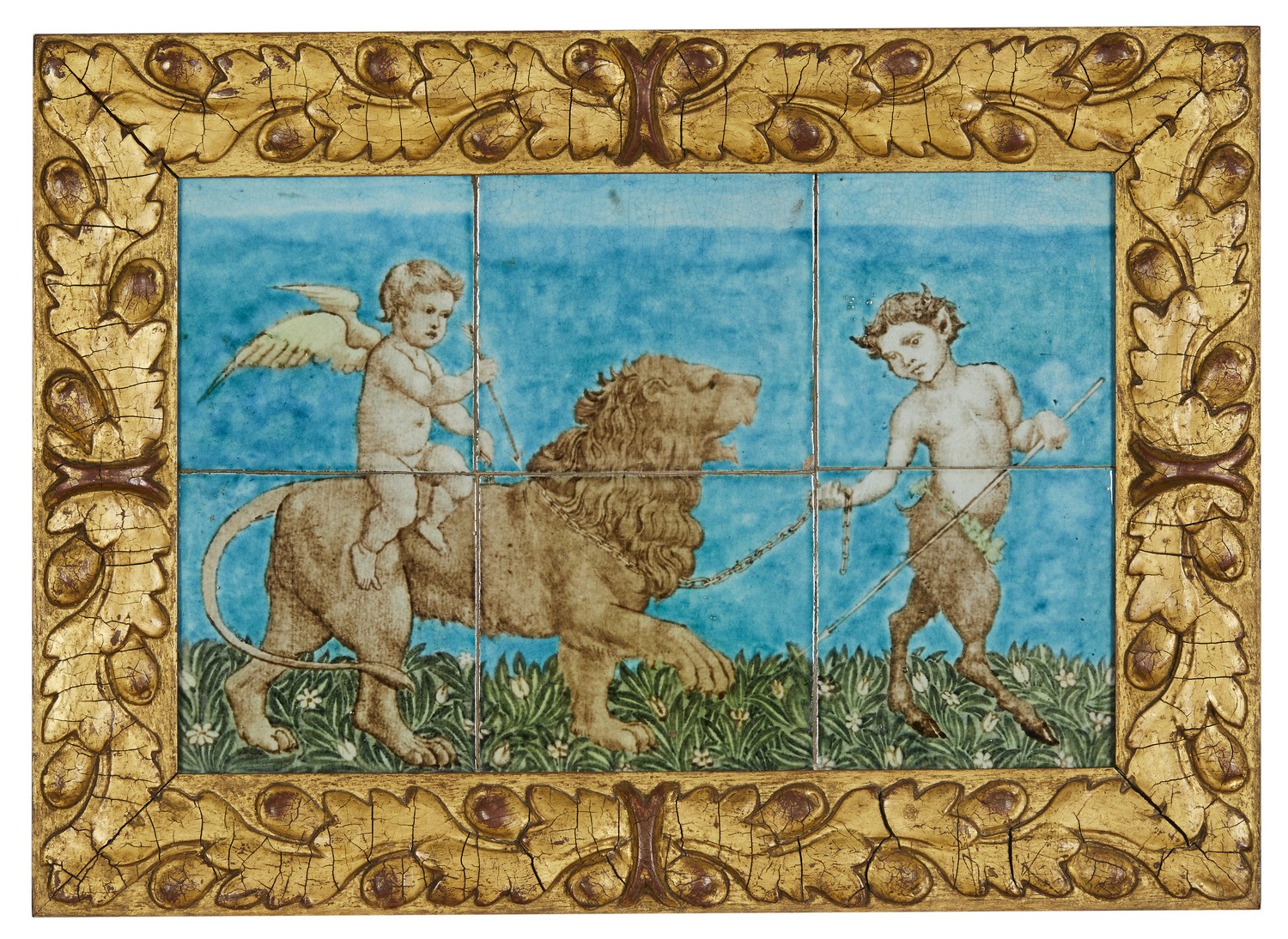 Comprising six tiles painted with a scene of Cupid riding a lion being lead by young faun, in stylised fruiting foliage moulded gilt frame, apparently unsigned.