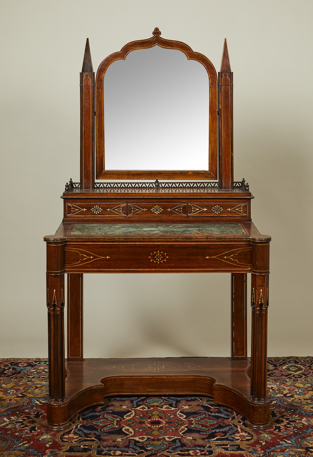 In "le Style Troubadour" the swivel mirror of ogee arch outline, on a superstructure with three concealed frieze drawers, the base with a green marble top above a concealed frieze drawer, on projecting cluster column front supports with shaped undertier, bone inlaid throughout with delicate gothic tracery.