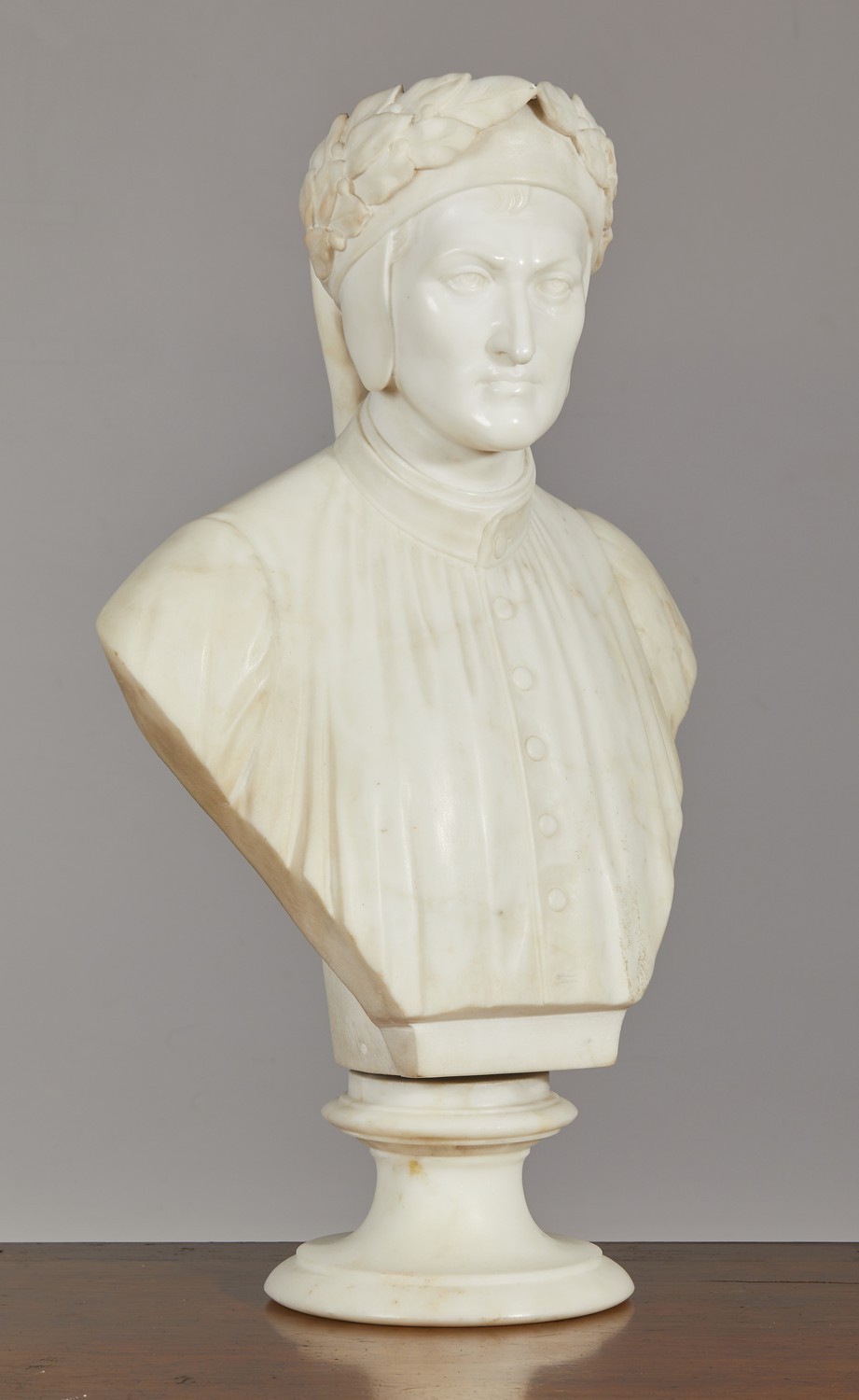 Depicted facing frontally wearing a wreath of laurels, over his cap the three-quarter length bust; on an associated marble socle.