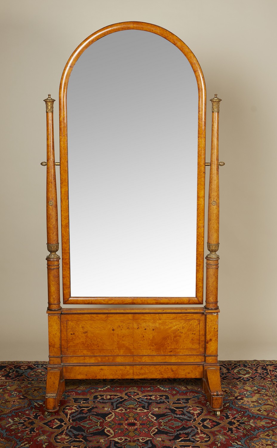 The arched swivel plate within ormolu mounted turned uprights, the panelled stretcher base with scrolled feet and castors.