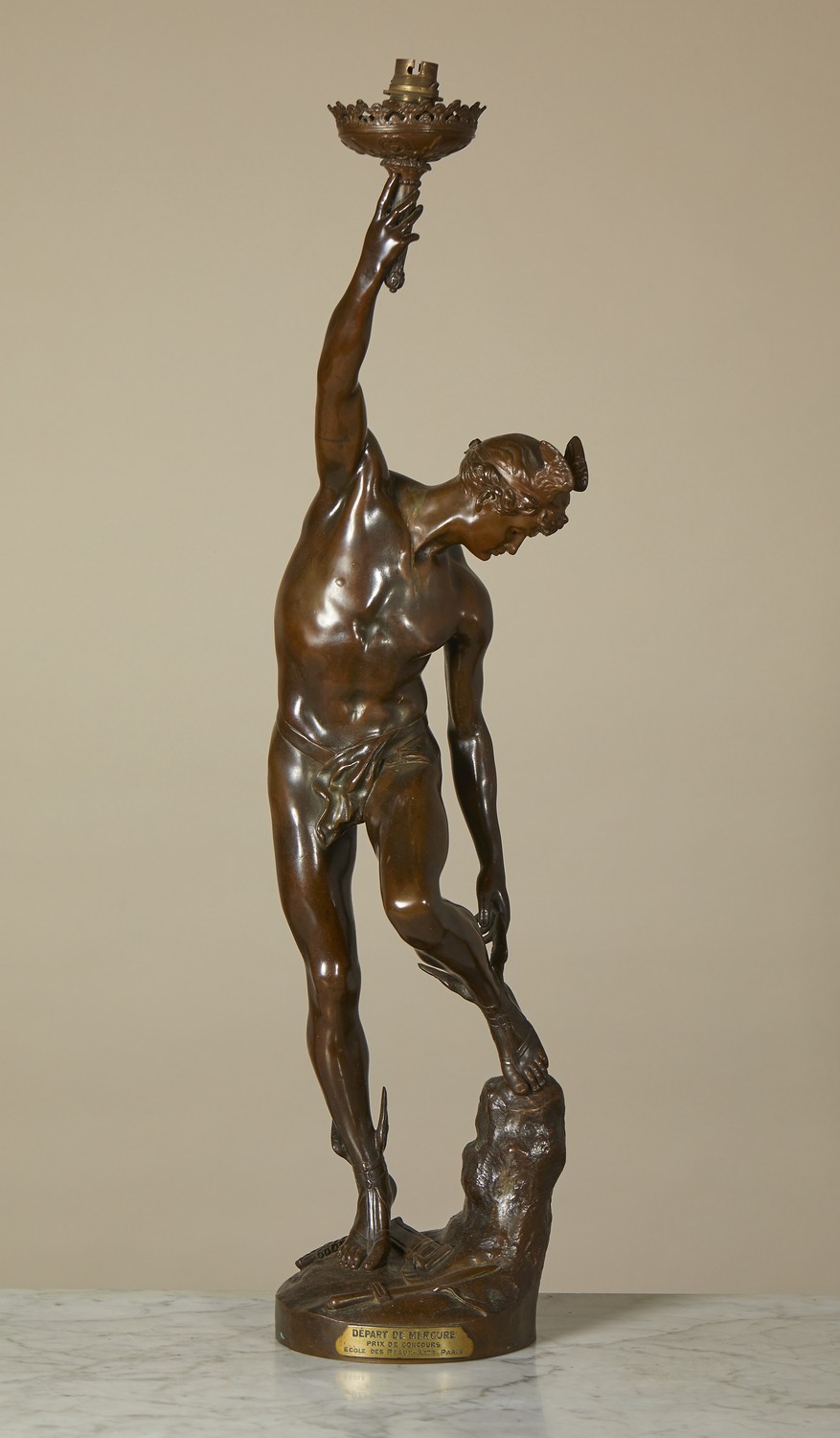 Titled to the plinth 'DEPART DE MERCURE PRIX DE CONCOURS ECOLE DES BEAUX-ARTS, PARIS" the naked god holding aloft a torch, adjusting his winged sandal.
