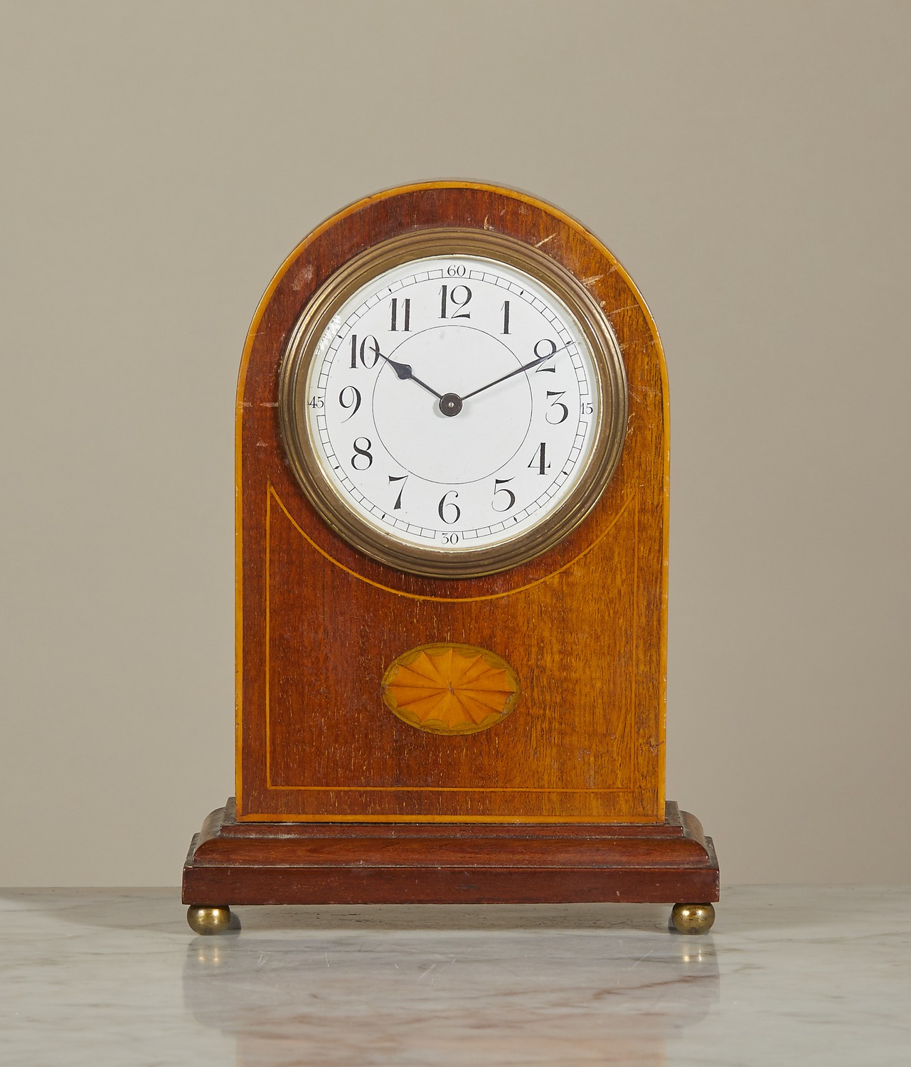 The enamelled dial with Arabic numerals in a brass bezel, the arched case with boxwood line inlay and a central patera, on a moulded base with brass bun feet.