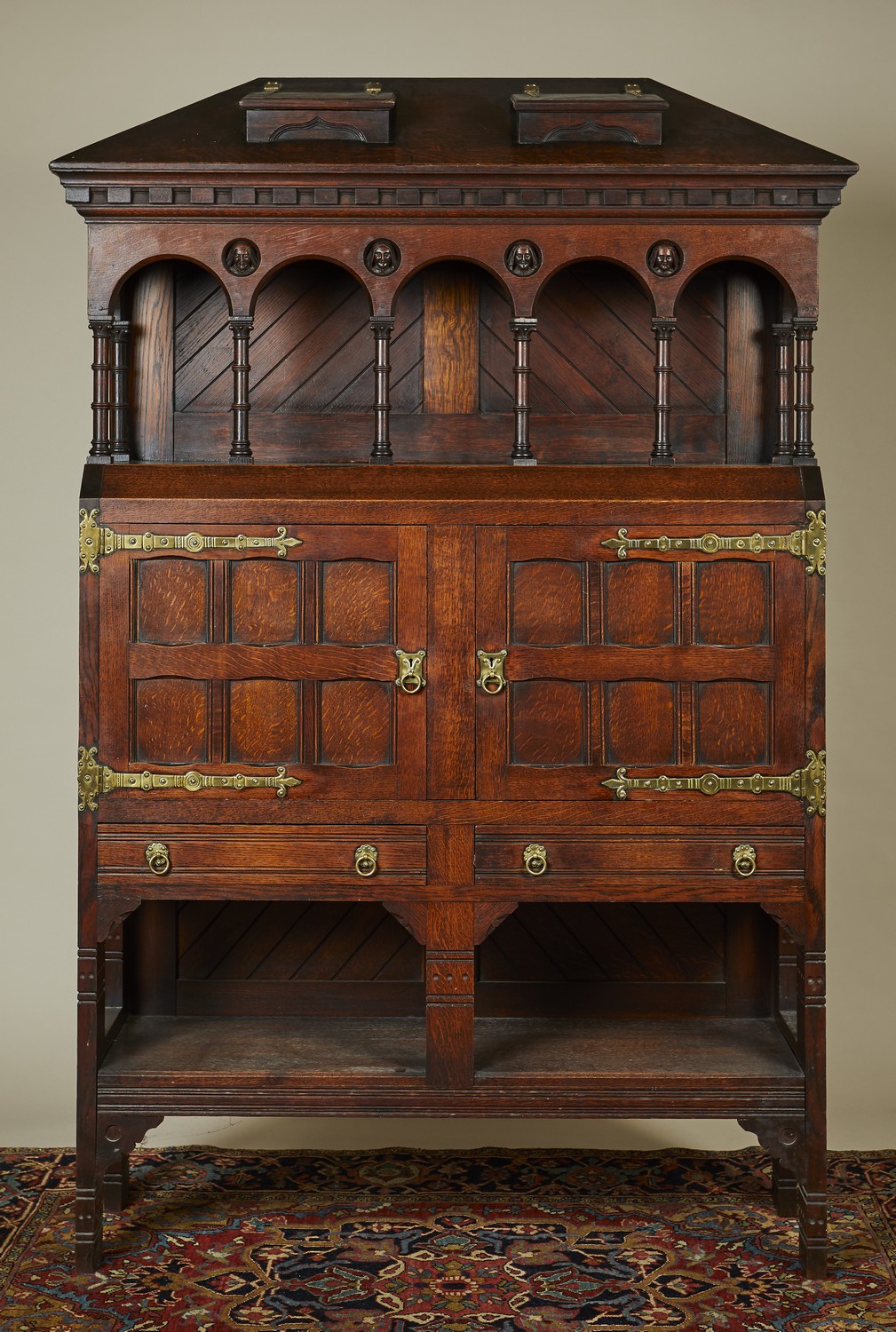Of architectural form the sloped top with two lidded compartments, above an arcade with roundels and human masks, the lower section with a pair of panelled doors with elaborate brass hinges above two drawers and two hutches, on bracket feet with incised decoration.