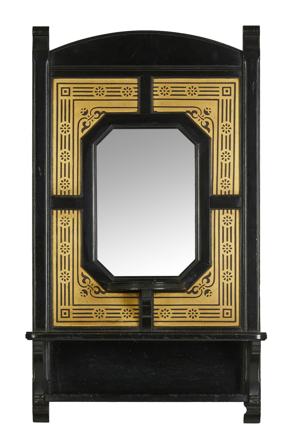 The central rectangular bevelled plate in a gilt stencilled surround with small semicircular shelf above a larger shelf in ebonised frame.