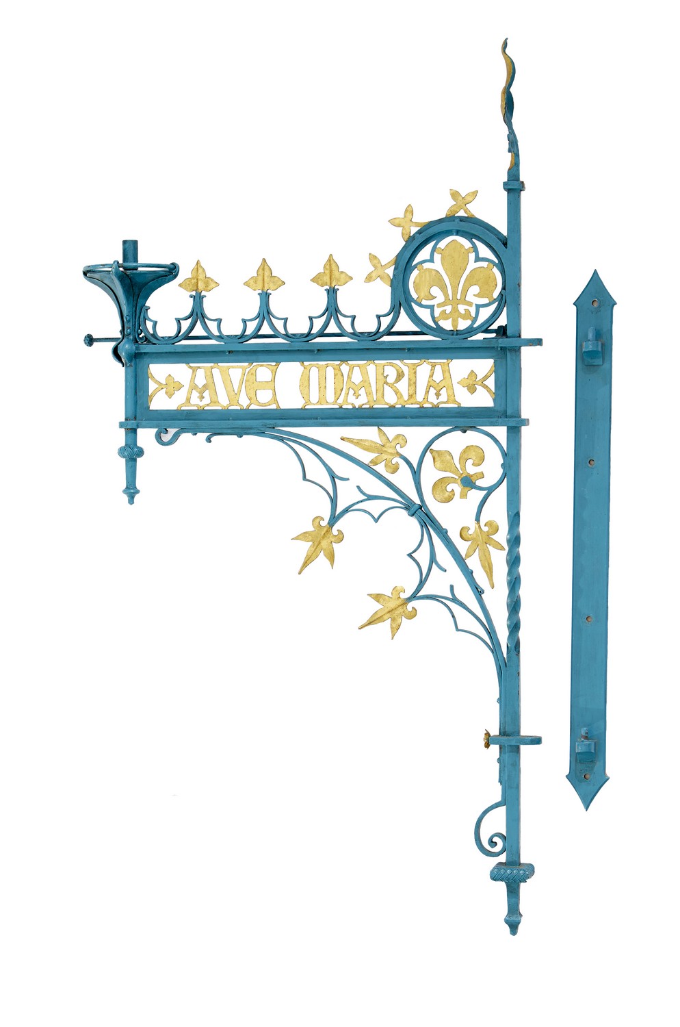 Painted blue with a gilt fleur de lys finial, the hinged bracket with a design of trefoils, fleurs de lys, and the words AVE MARIA.