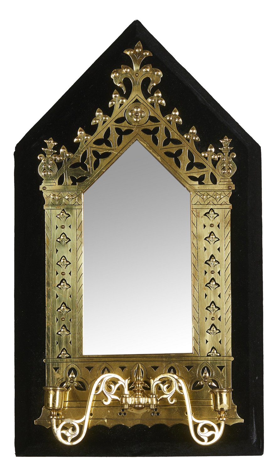 Having a bevelled mirror within a pierced frame composed of foliate crockets, above a double scrolled candle bracket, on a later black velvet mount.