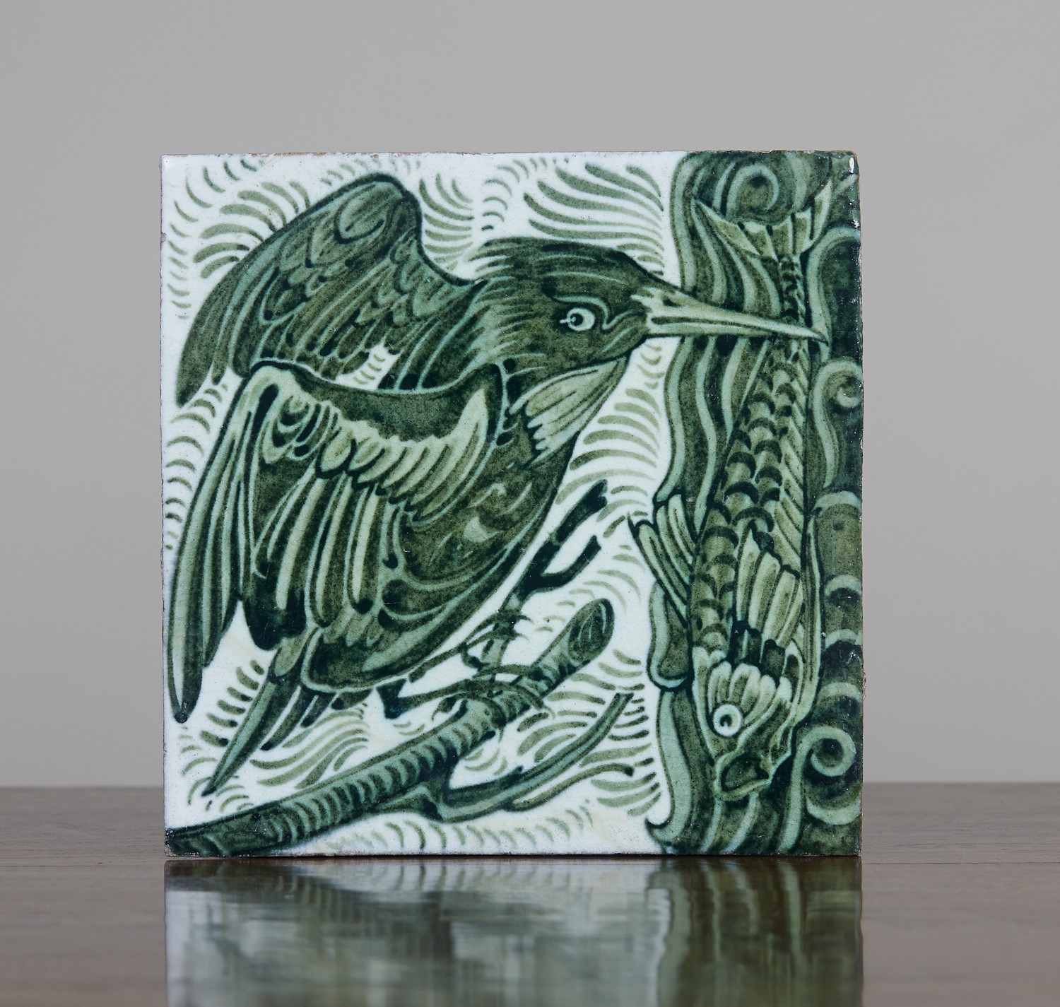 Painted with a kingfisher and a fish in green, impressed mark to reverse.