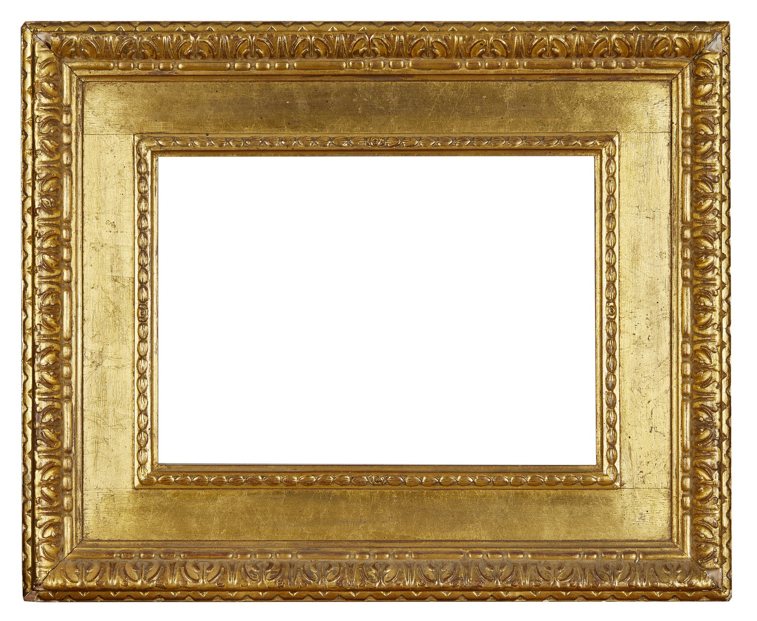 With moulded leaf, bead and geometric decoration, fragmentary retailers and exhibition labels to verso.