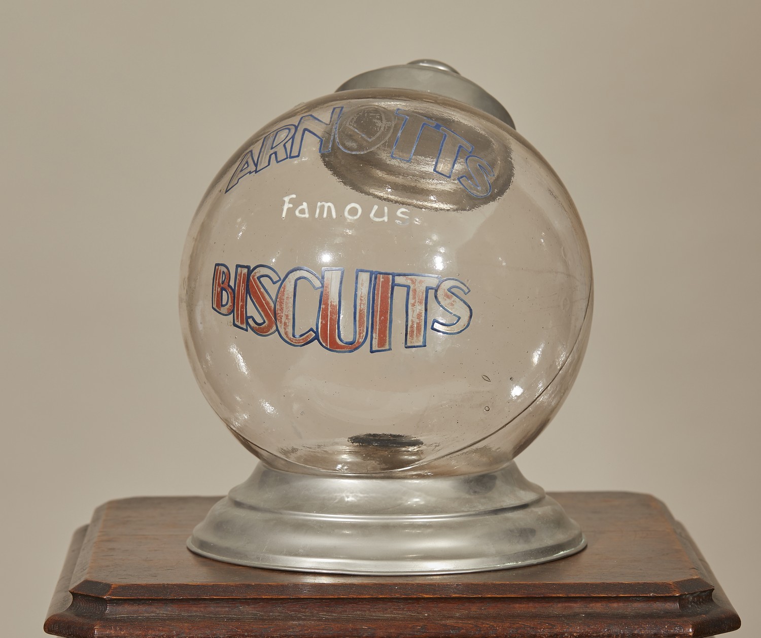 With aluminium cover and foot, enamelled to the glass "ARNOTTS FAMOUS BISCUITS".