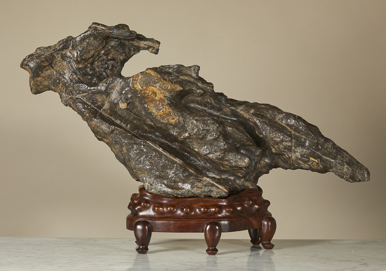 Dragon shaped, on a carved rosewood stand.