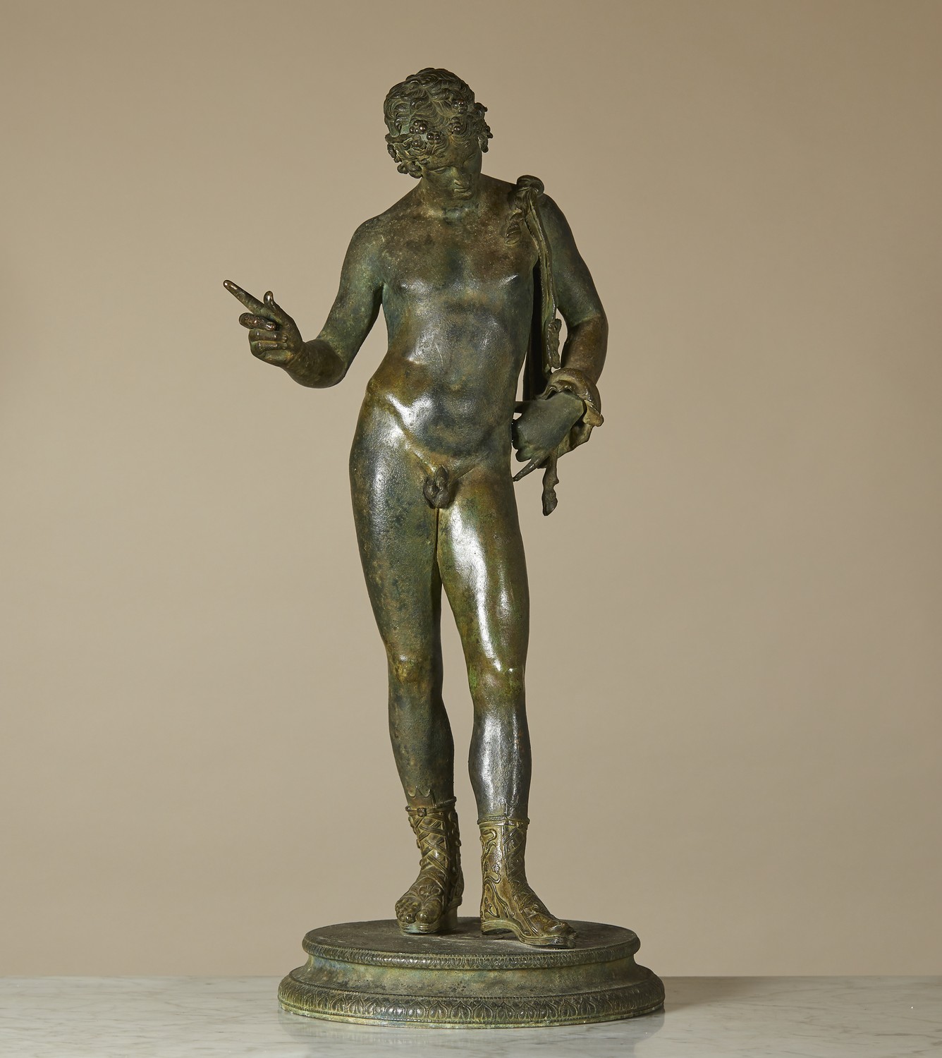 Possibly by the Chiurazzi Foundry, the naked youth looking down with a pelt on his shoulder and sandalled feet, on a circular plinth with leaf cast moulding, patinated finish.