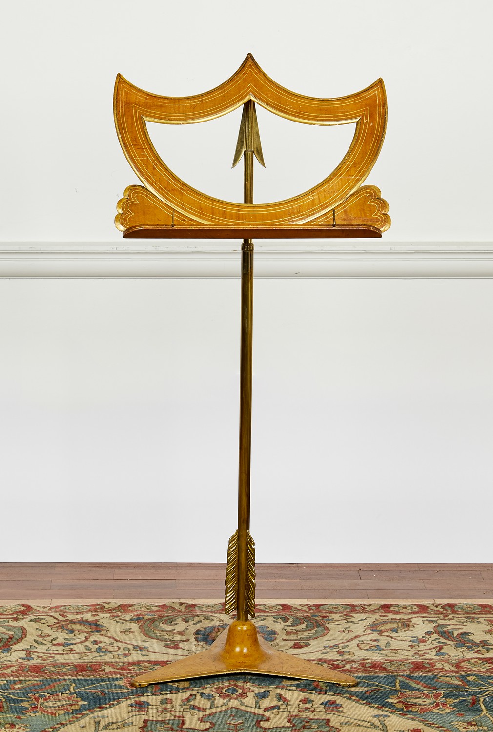 The shield shaped rest with gilt line decoration, on an arrow support and triform iron base grained to represent satinwood.
