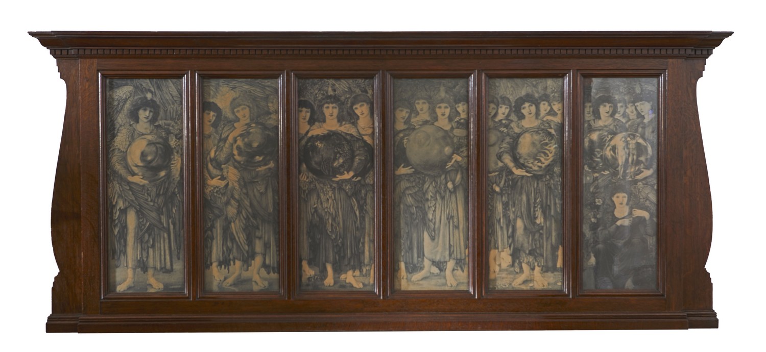 set of six photogravures in a six panel Pre-Raphaelite style oak frame