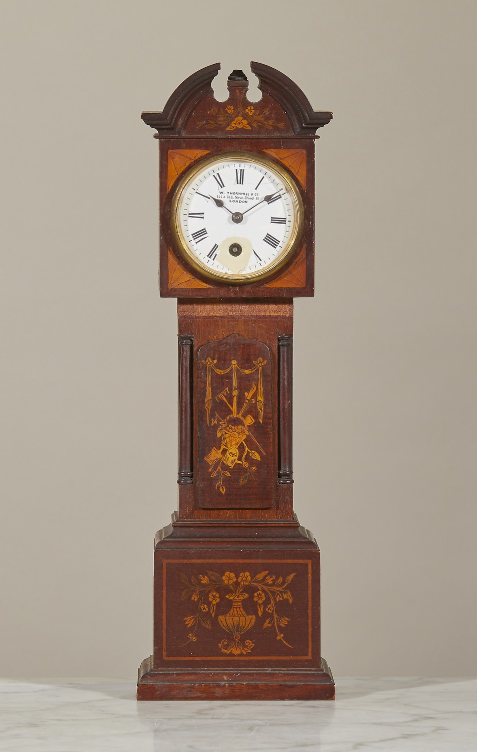 The movement by W. Thornhill & Co, 144 & 145 New Bond Street London, in a Georgian style mahogany case inlaid with flowers and a gardening swag to the trunk door.