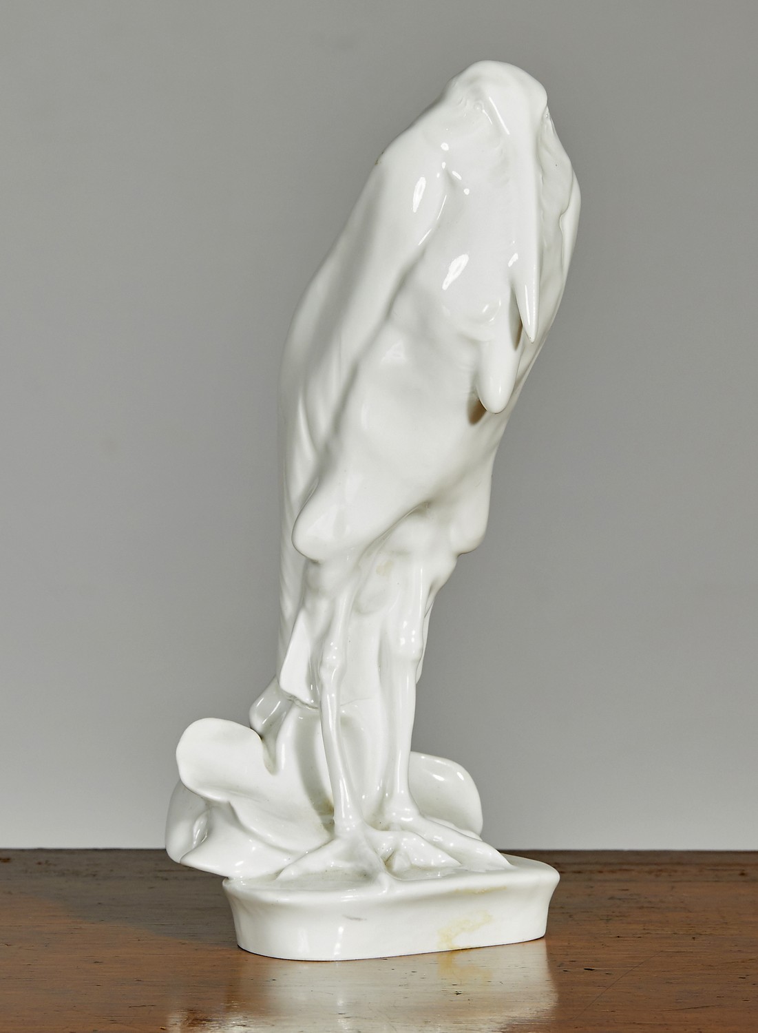 Underglaze blue crossed swords mark, and pressnummer W149, the bird standing on a triangular base with foliage.